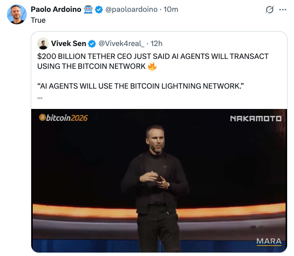 Op ‘s werelds grootste Bitcoin event heeft, wederom, de CEO van Tether een interessante uitspraak gedaan: volgens de CEO zouden namelijk het overgrote deel van alle AI agents die de komende jaren actief zullen worden gebruik maken van het Bitcoin netwerk, specifieker het Bitcoin Lightning netwerk, voor het verrichten van financiële transacties. De CEO, Paolo Ardoino, geeft aan dat de agenten ‘trillions of payments per day’ zullen maken, hij heeft het hier over peer-to-peer transacties; directe transacties tussen individuen zonder de tussenkomst van derden.